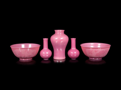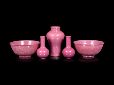 清晚期 粉料開光花鳥紋碗一對、小天球瓶一對及梅瓶一尊