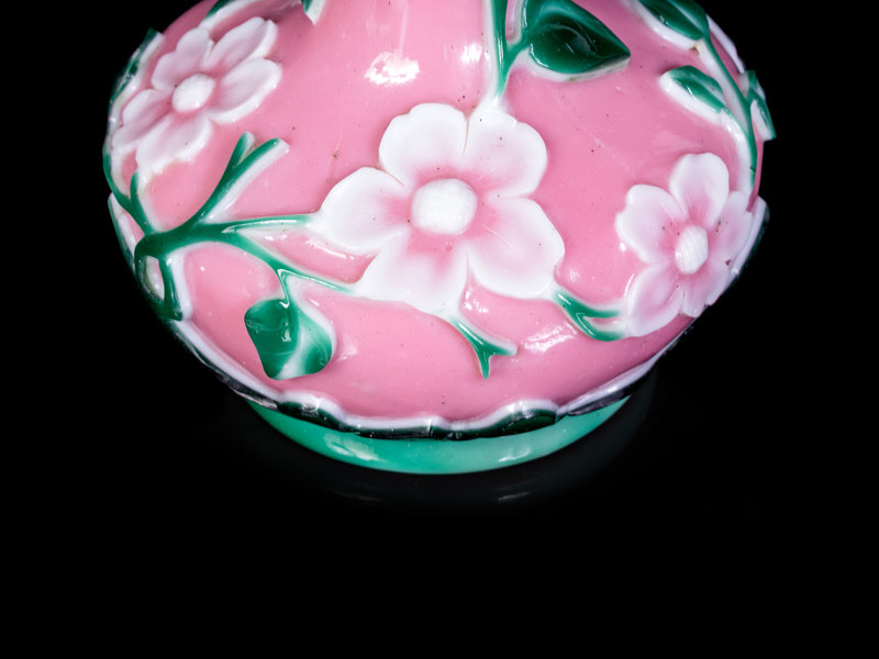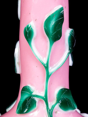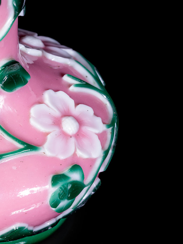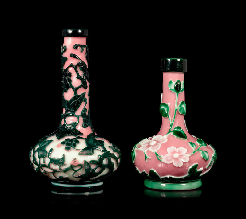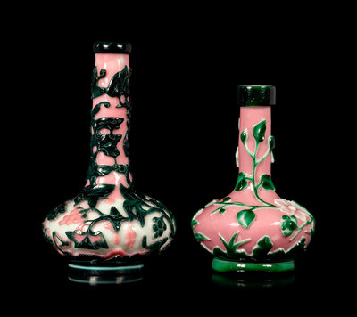 Two Chinese Pink, Green and White Glass Bottle Vases