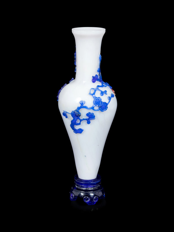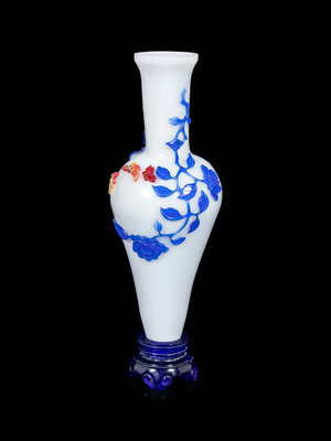 the opaque white body having high rounded shoulders emerging from a delicately tapered body, with a columnar neck rising to a slightly everted mouth rim, all supported by an integral stand, carved of transparent sapphire blue with four cantilevered ruyi form feet. Carved through an overlay of cobalt blue mottled red and yellow with descending branches of peony and prunus punctuated by butterflies.