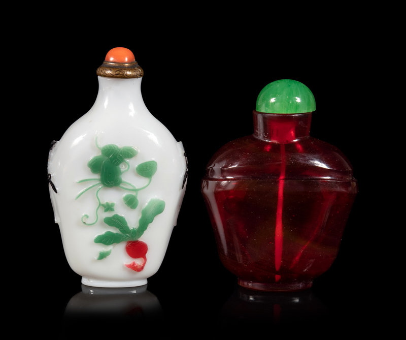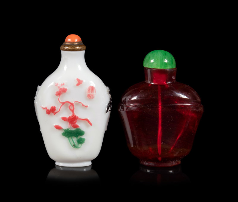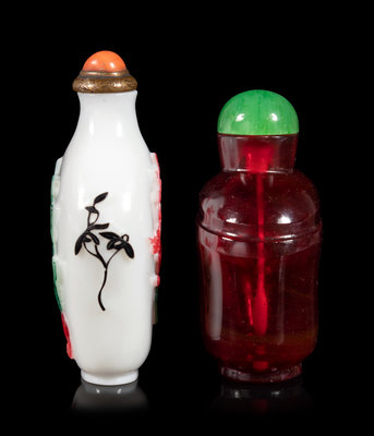 the first of shield form, worked of opaque white glass, carved through the tricolor overlay of red, green, and black; the second of transparent ruby-red, with an opaque stopper.