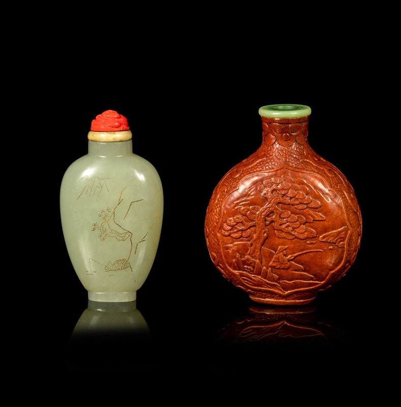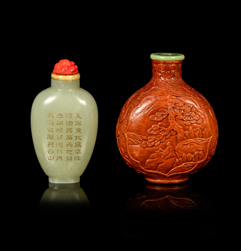 清中期 青玉題詩鼻烟壺及匏製砑花山水圖鼻烟壺