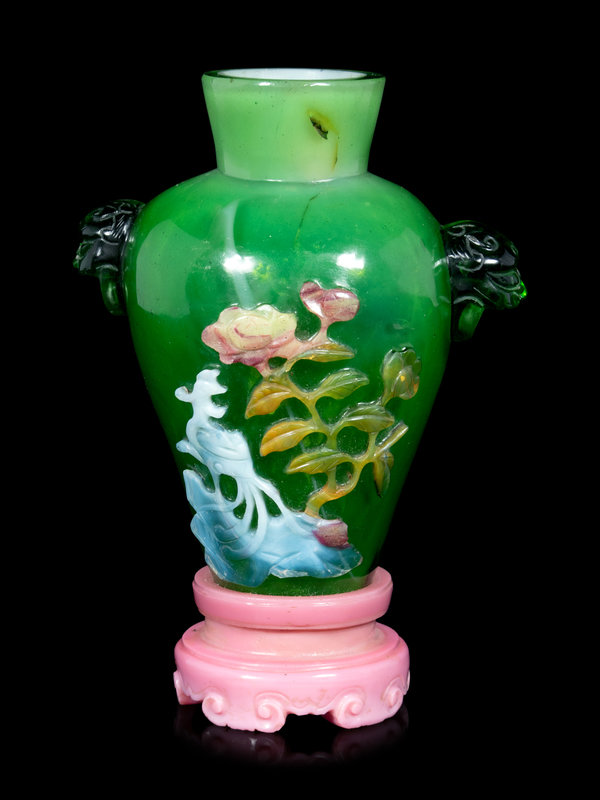 of baluster form, the thin layer of transparent green glass worked over a layer of opaque white, the sides with white, amber, and pink overlay showing peococks beneath large peonies above rockwork, all above an integral en suite pink stand carved with bracketed ruyi-form feet.