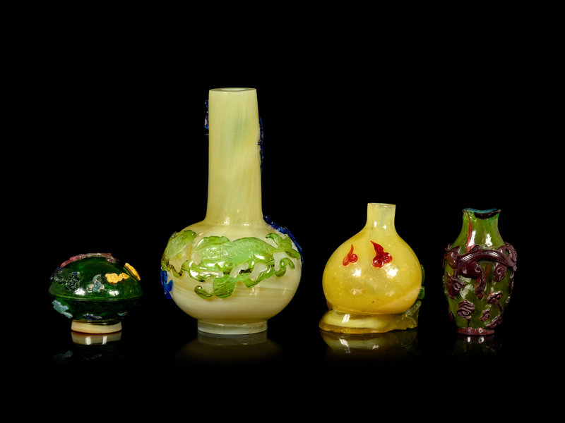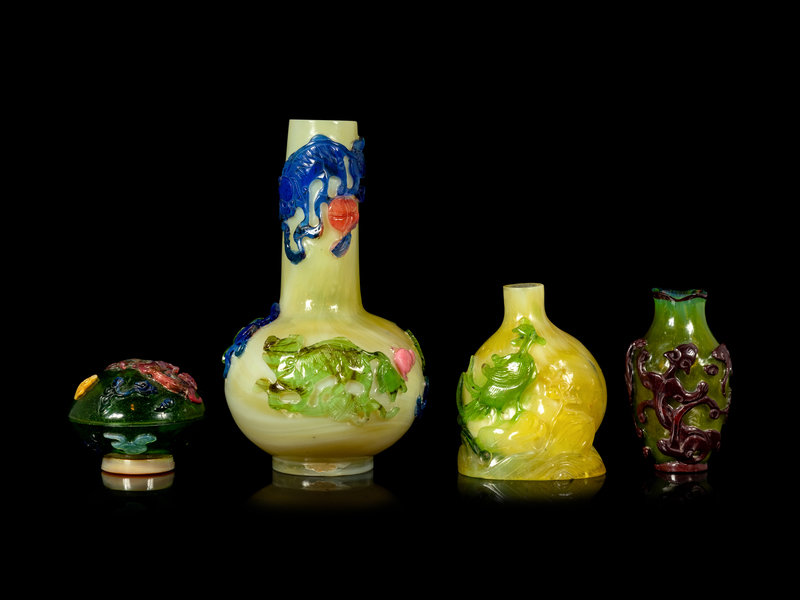 comprising a transparent green circular box and conforming cover, all raised above a banded honey-toned splaying foot, carved through the polychrome overlay in high relief with chilong winding through tufts of cloud scrolls; a stout bottle vase of translucent swirled white and yellow glass, worked to the globular body and columnar neck in opaque and transparent tones to show mythical beasts. The third example an unusual pale jar, worked from the yellow and white glass with an integral rocky base of naturalistic form, applied with transparent phoenix overlay. The last a petite transparent green vase, the body of shield form and rising to a foliate mouth rim, the ruby overlay carved with chilong amidst lingzhi sprigs.