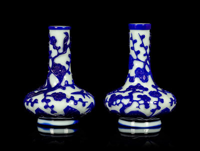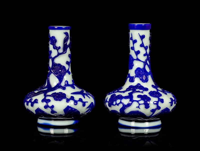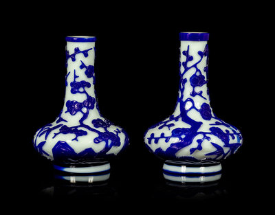 A Pair of Chinese Blue Overlay Opaque White Glass Bottle Vases