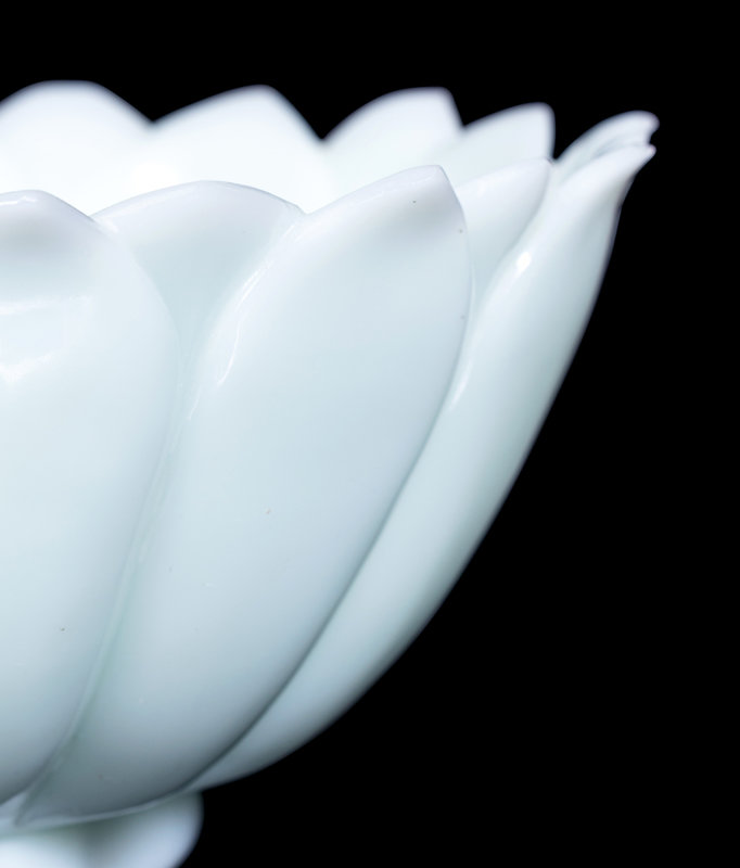 each worked of rich opaque glass to show the multi-foliate sides rising to a petaloid mouth rim above a sectioned foot.