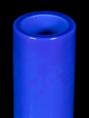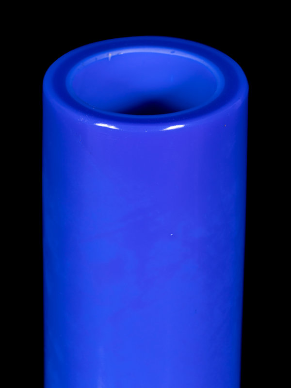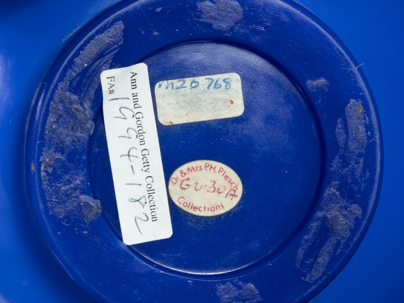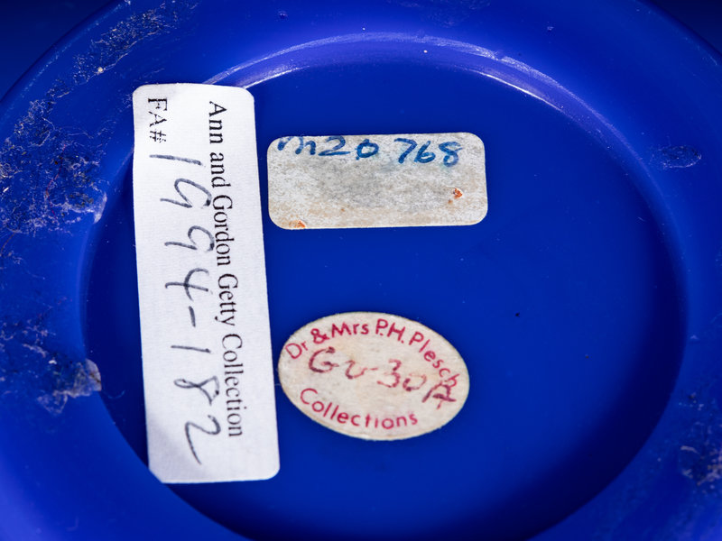 the body of deep blue with a pale swirl, rising from the straight foot to a globular body and columnar neck.