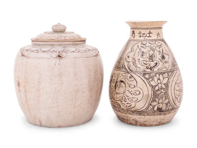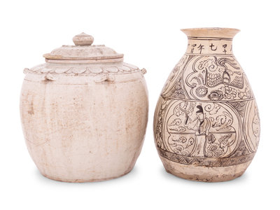the first a white glazed jar and cover, the jar with plain walls carved with lotus petals encircling the mouth rim above molded handles, the cover and finial worked in continuation of the floral motif; the second a Cizhou jar of baluster form, the white ground painted with two friezes showing figures reserved against a lotus bud and and cloud scroll ground.