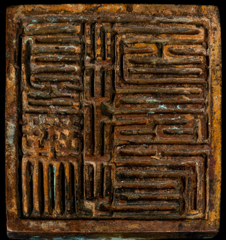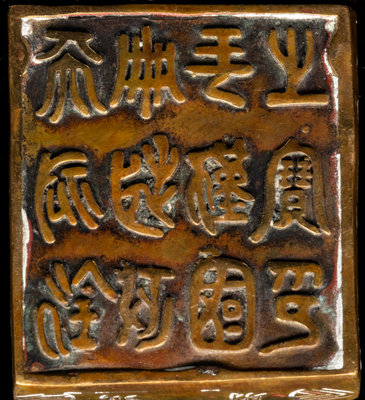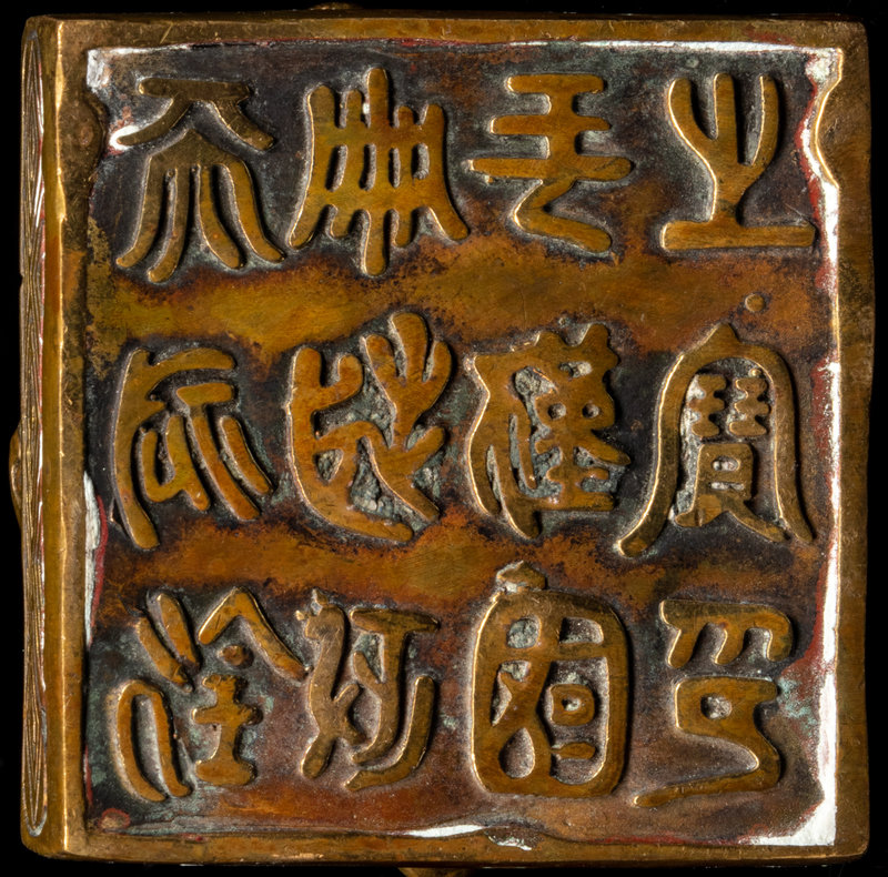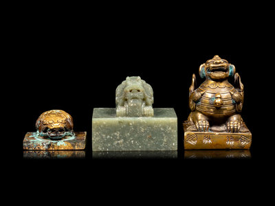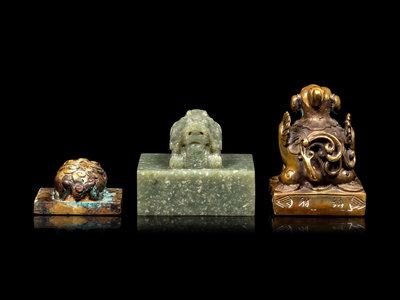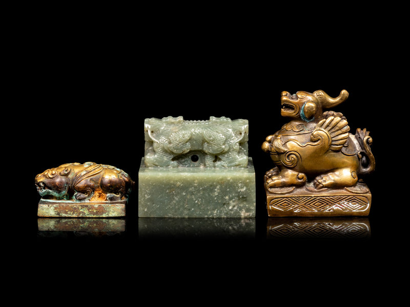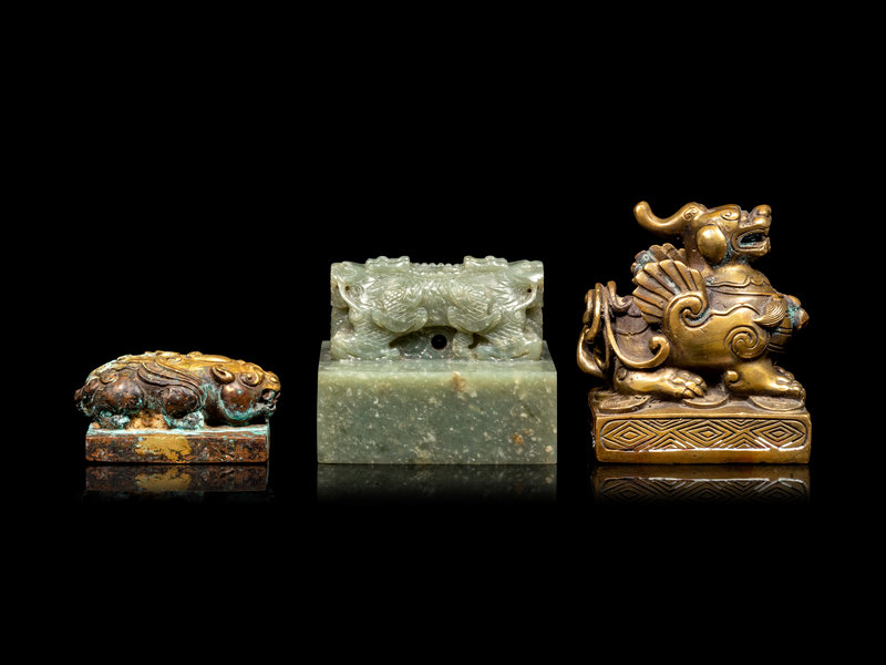 comprising two gilt bronze examples and one carved hardstone example, each of square form and topped by a mythical beast-form finial.