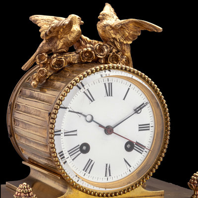 鳥音鈡是法國鐘錶大師Blaise Bontems (1814-1893) 的天才設計。由底座、布景箱、鐘表組成。底座内裝置音樂及鳥鳴機械。布景箱内小小山丘間站立一自鳴小鳥,上弦啟動後,先打樂,樂聲之後鳥鳴,小鳥張嘴擺頭搖尾,背後蝴蝶形擺錘左右移動,極為生動傳神。上部為三針鐘,鐘上飾雙鴿,展翅對鳴,極富趣味。鐘表之機芯不與底座的機械聯動。同一款式的鳥音鈡在故宮藏有兩件,編號故00183577,故00183575。