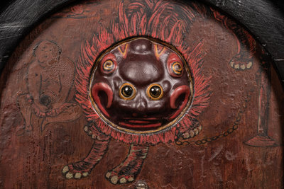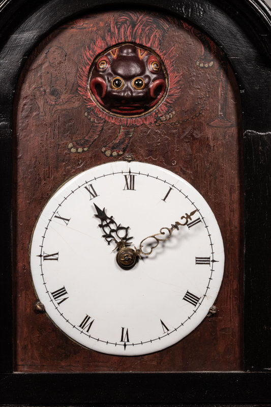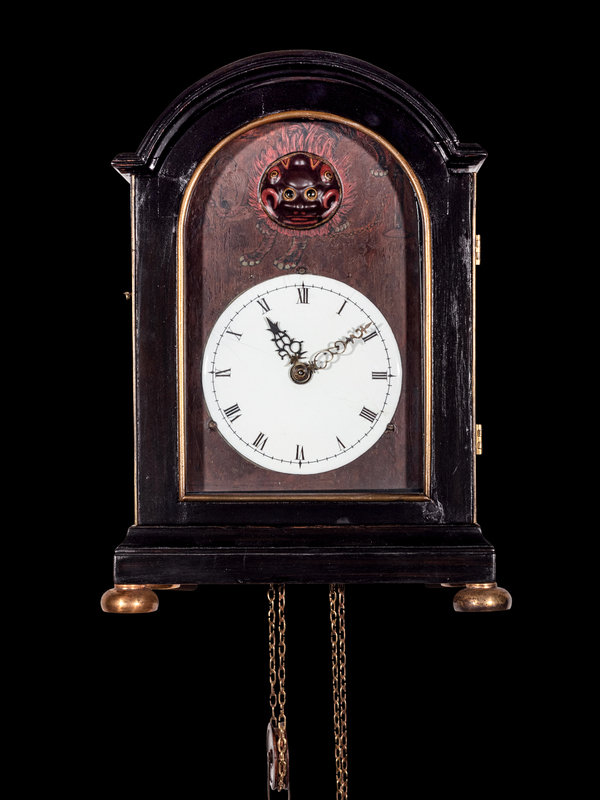 the case carved of domed form, supported above four rounded gilt lacquered feet. The dial enameled with Roman hours, set within a painted ground, the top section detailed with an immortal figure beside a leashed lion, the eye moving with automaton function, and having a large gourd-form weight.