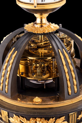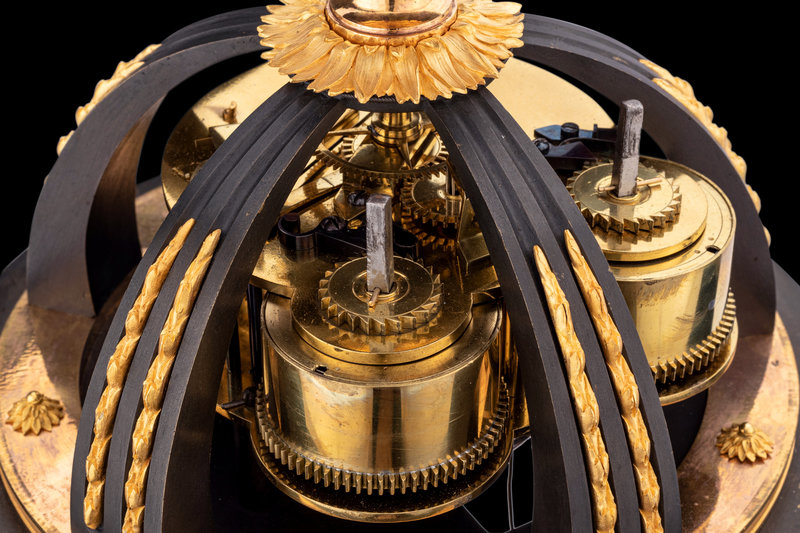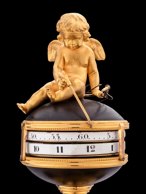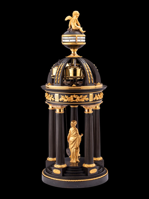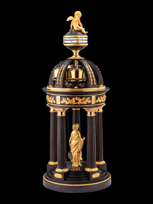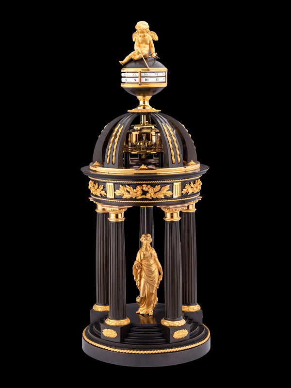 鍍金銅飾與黑漆鑄鐵相間,構成希臘式門廊,當中立有愛神阿芙洛狄特的小像,輕提裙擺,款步而出。圍柱在門廊上端聚攏,容納複雜精密的機芯,時鐘與分鐘以雙環結構并置,丘比特的小小金箭充當指針,匠心獨具。