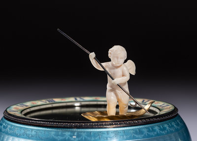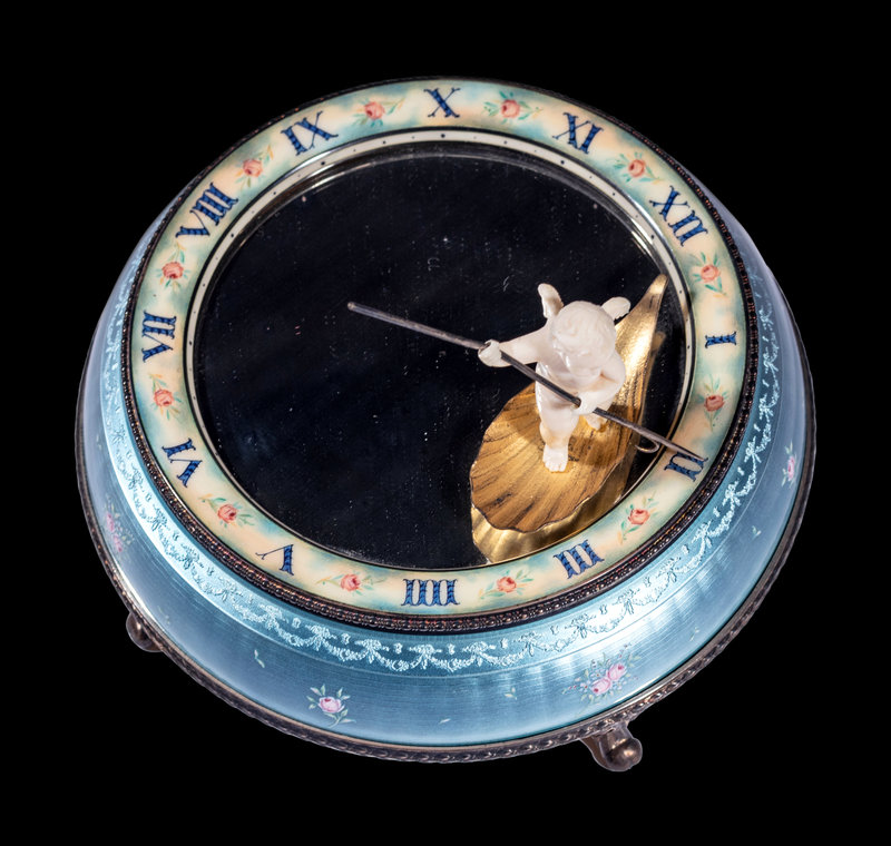 盈掌大小,機芯全部隱藏,秀美的天藍色琺琅嵌入鏡面,下方磁鐵聯動機芯,帶動白胖的小天使駕一葉扁舟走時,幼細的寳藍色羅馬刻度間繪以粉色玫瑰,和鈡座相襯。