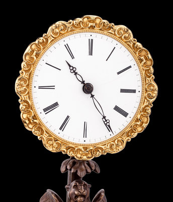 having an enameled dial with Roman numerals raised on a winged beast form support over the putto and foliate decorated base, the whole set on a giltwood stand.