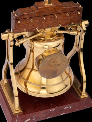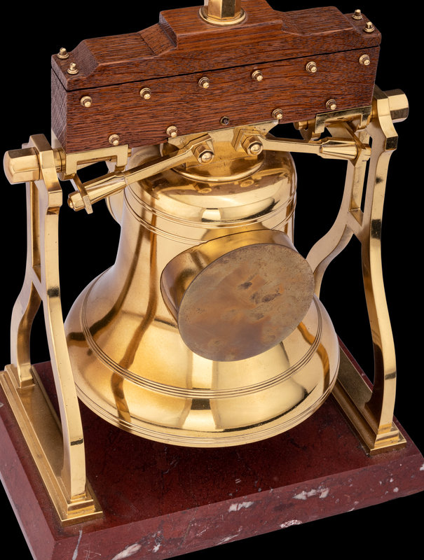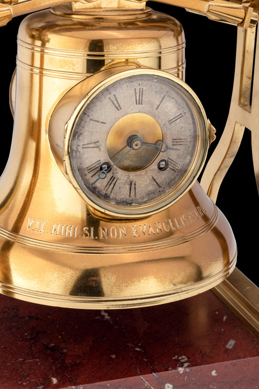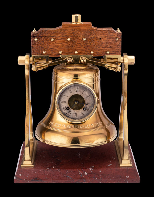 modeled as a bell hanging from an oak headstock on two A-form supports, the bell with a silvered dial with Roman hours above the Latin inscription VAE MIHI SI NON EVANGELISAVERO, the works stamped with circular Japy mark, further numbered 1178 and marked MADE IN FRANCE.
