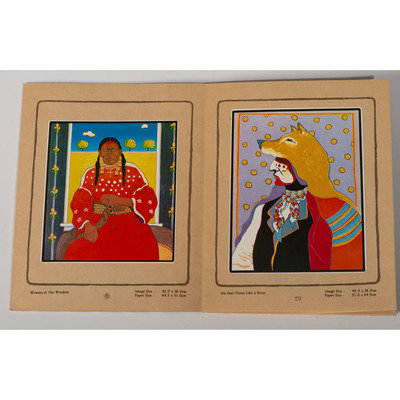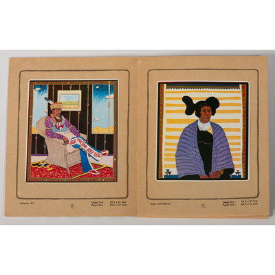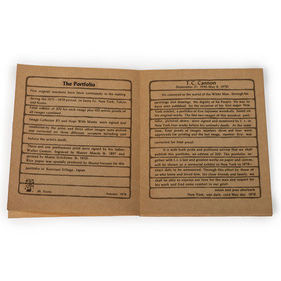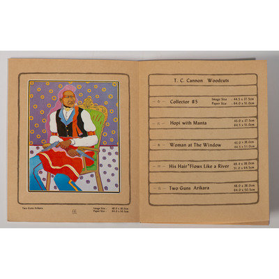 Book includes diminutive copies of T.C. Cannon woodcuts (Collector #5, Hopi with Manta, Woman at The Window, His Hair Flows Like a River, and Two Guns Arikara). Printed in Japan, 1979.