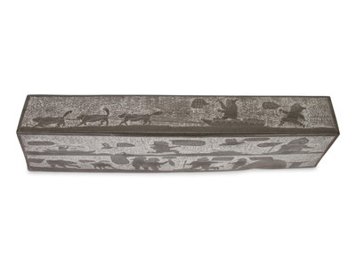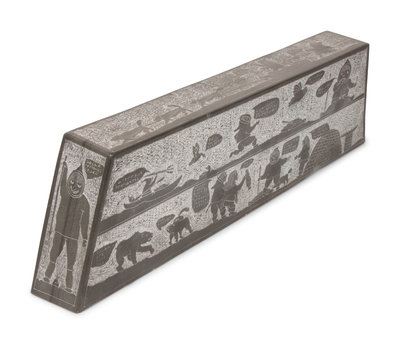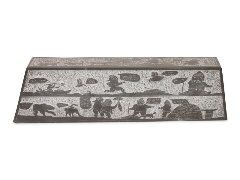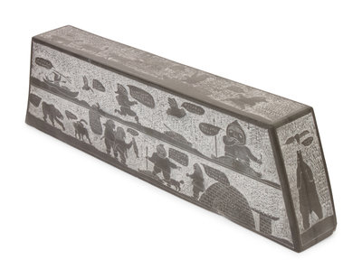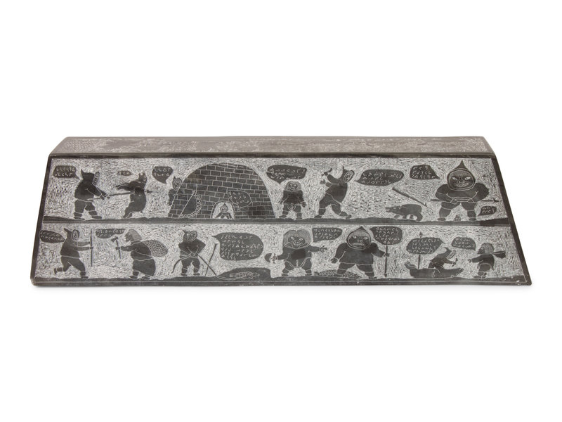 , 1992frieze style sculpture carved with scenes of Arctic life; figures having colorful conversations in syllabic