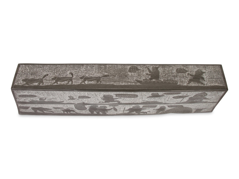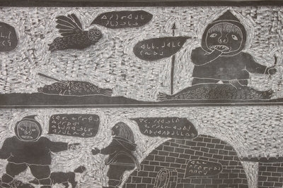 frieze style sculpture carved with scenes of Arctic life; figures having colorful conversations in syllabic