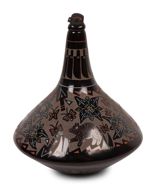 a blackware lidded jar, with sgraffito bears, butterflies, and flowers