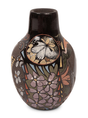 a miniature backware jar, colorfully painted sgraffito design of butterflies and flowers