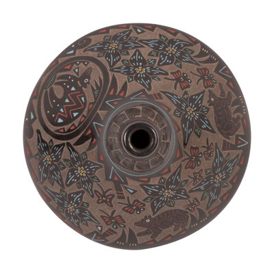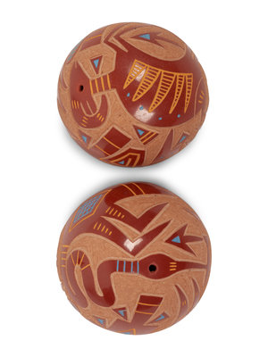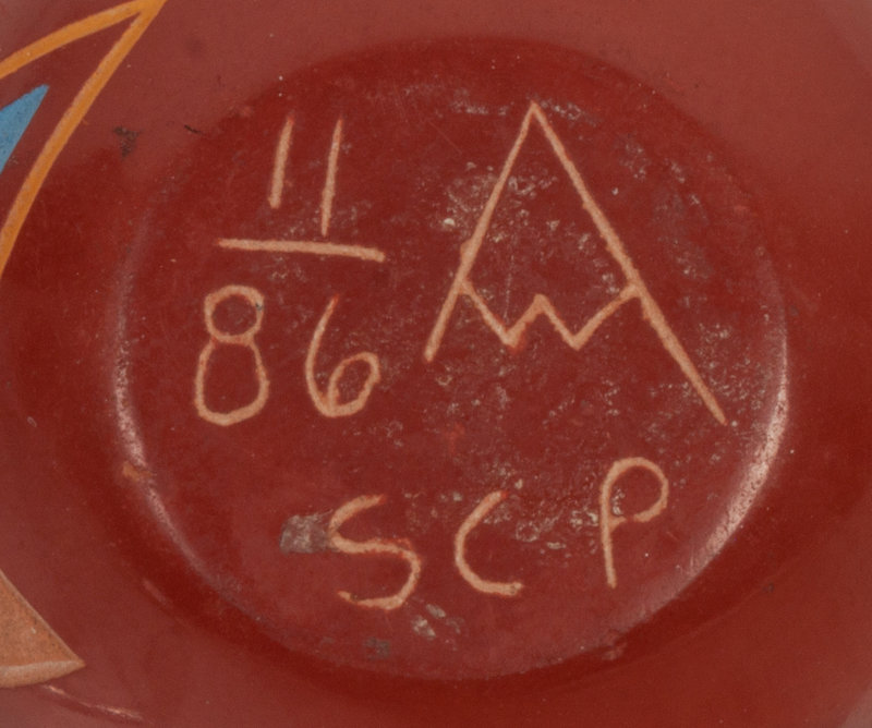 a miniature redware seed jar, colorfully painted sgraffito design of a Mimbres-style mountain goat