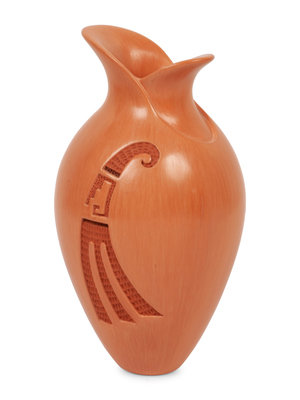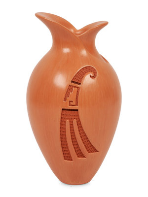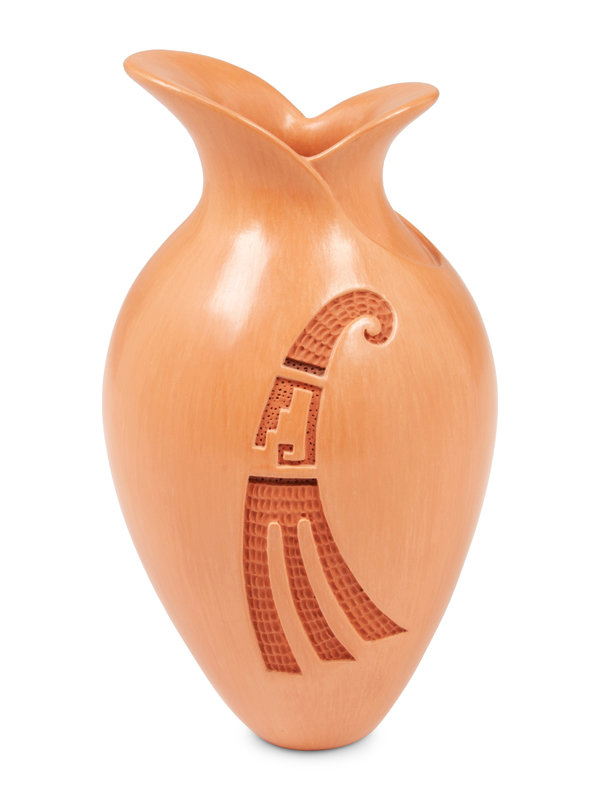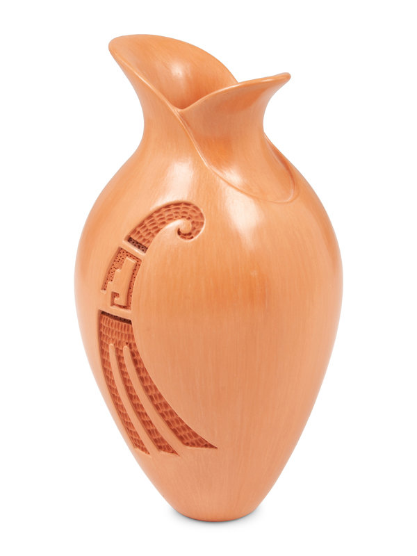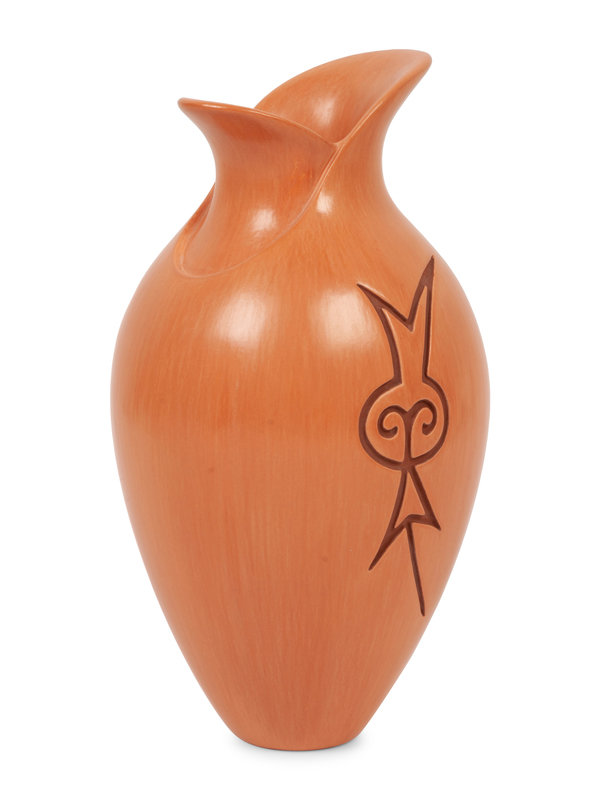 with deeply carved flower on one side; opposite having wing with textured impressions; signed and dated on base