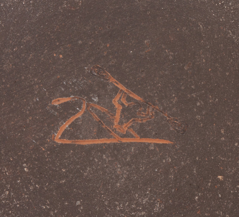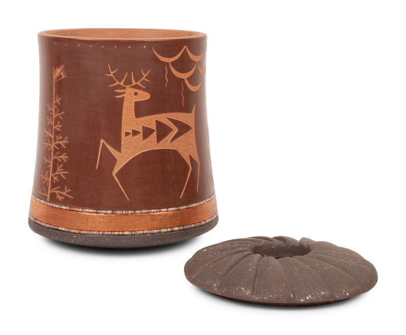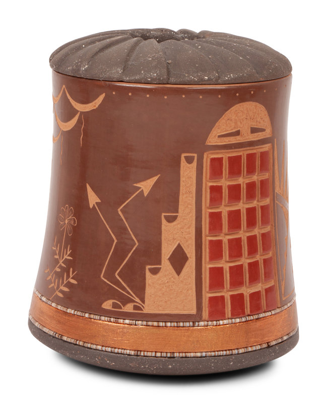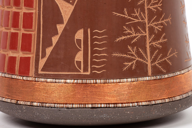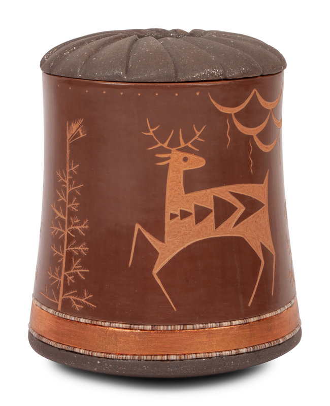 body with sgraffito decorations; having brushed copper band bordered with two strands of heishi; micaceous lid; hallmarked on base