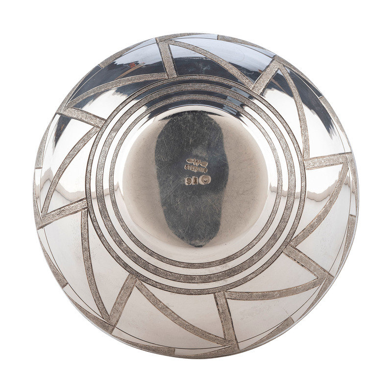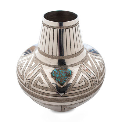 geometric and feathered designs, accented by a triangular shaped turquoise cabochon; signed on base with a W with an arrow through it, marked STERLING, and dated 91