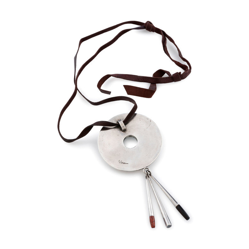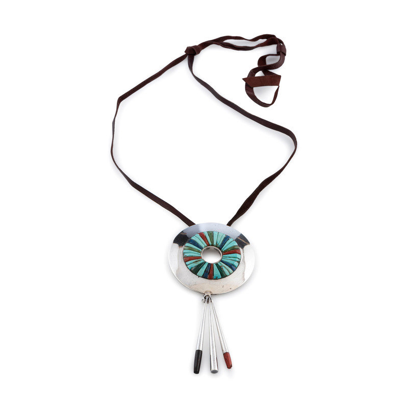 strung on a leather thong, featuring a circular silver pendant set with turquoise, coral, serpentine, malachite, and lapis mosaic inlay; three silver pendant dangle from lower edge, one set with ironwood and another with coral; signed loloma on reverse