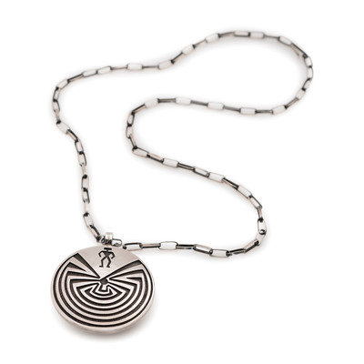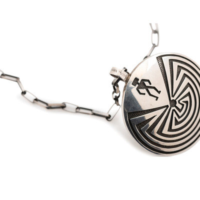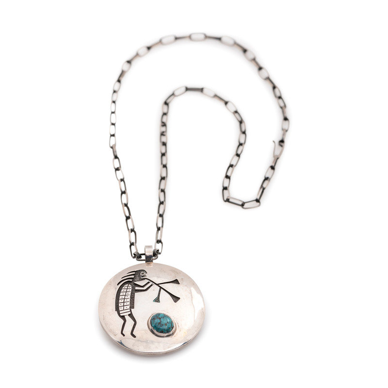 reversible silver overlay pendant features a flute player and turquoise cabochon on one side and a man in the maze decoration on the other; signed on pendant finding with artist's raincloud hallmark and a flute player hallmark for Kopavi International (Shop, est. 1976)