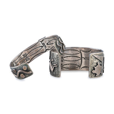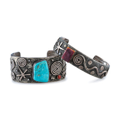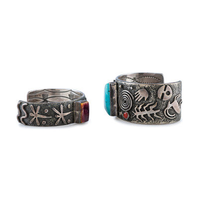 a cast silver cuff featuring animal designs and set with a larger central turquoise cabochon and a smaller off centered coral cabochon