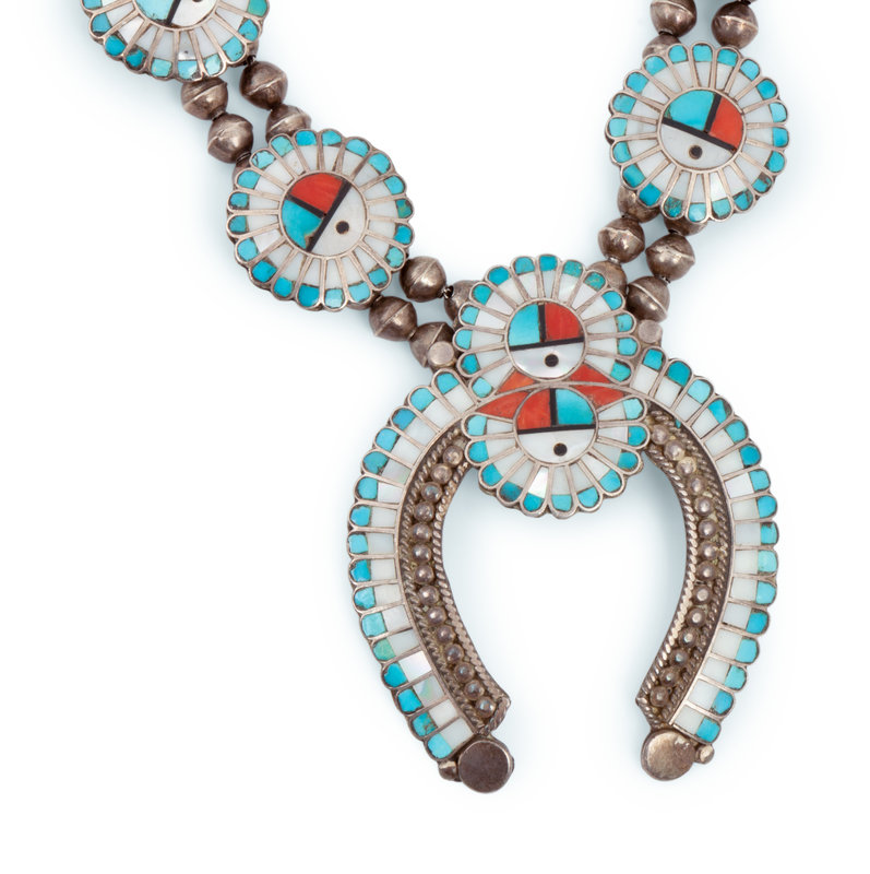 Zuni Silver and Mosaic Inlay Sunface Squash Blossom Necklace