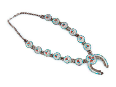 twelve squash blossoms and matching naja, each set with turquoise, coral, shell, and jet mosaic inlay