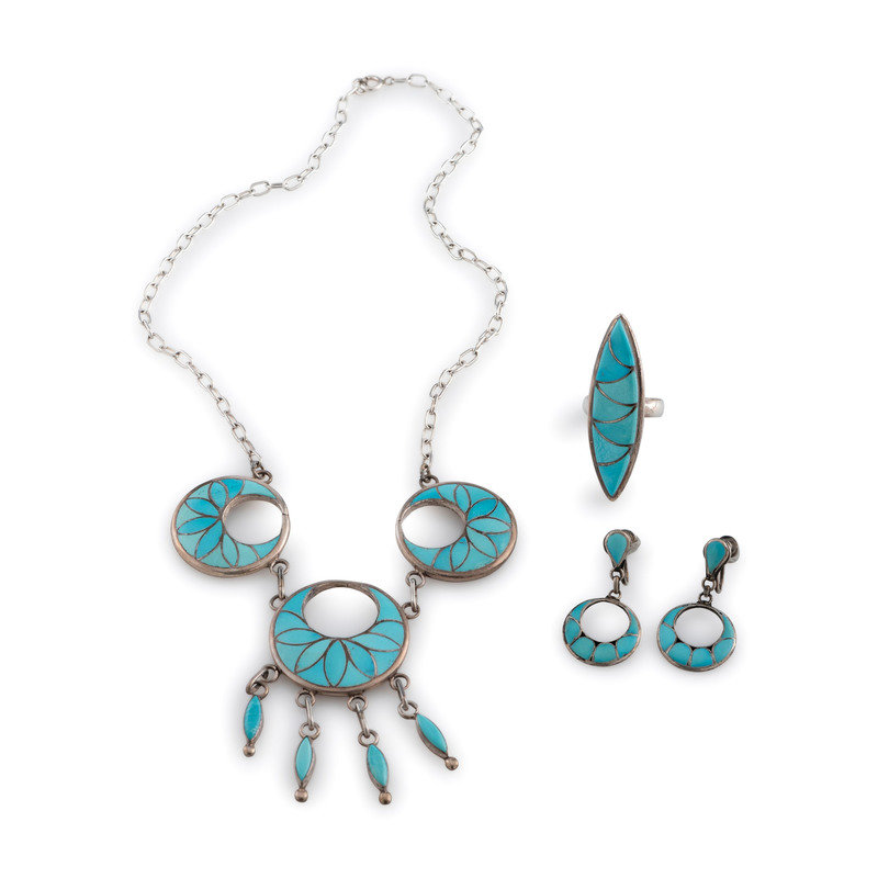 Silver and Turquoise Channel Inlay Necklace, Ring and Screwback Earrings Set