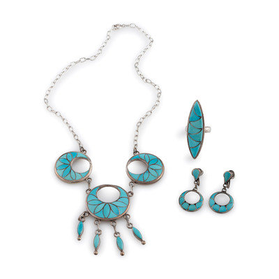 lot of 3, the ring and necklace marked with artist's fleur-dis-lis hallmark; earrings unmarked