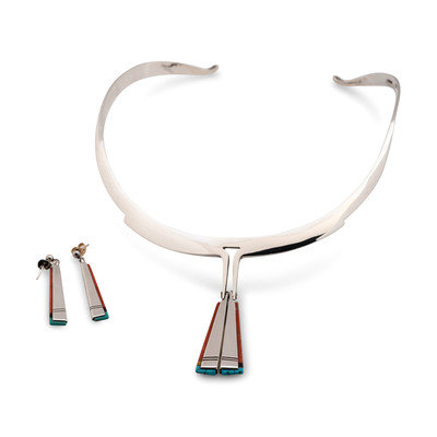 Silver Choker and Matching Post Earrings, with Coral, Jet, and Turquoise Mosaic Inlaid Edges