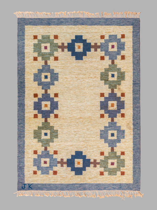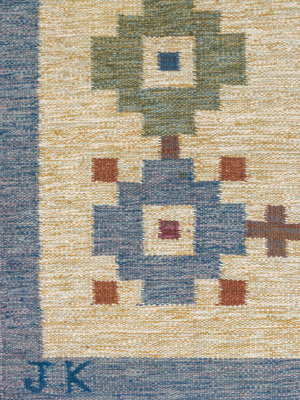 woven signature to edge 'JK'