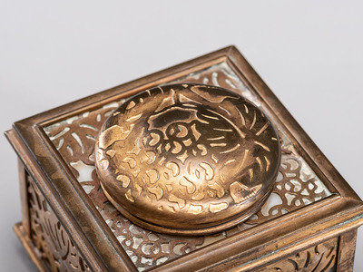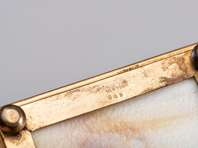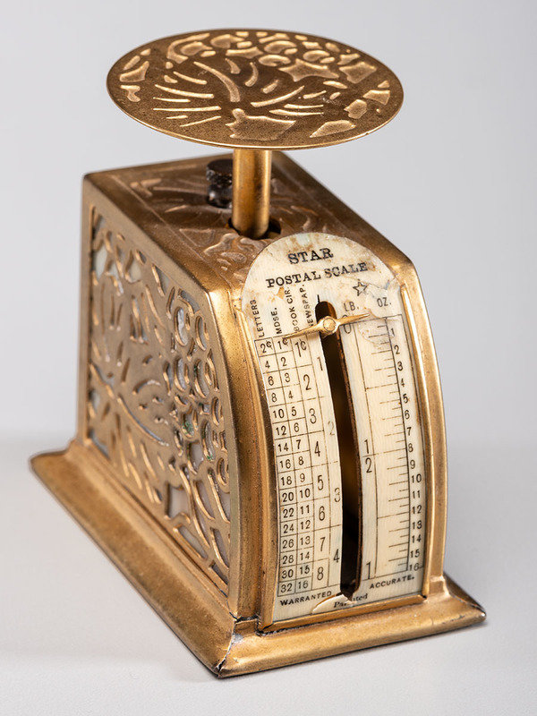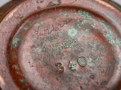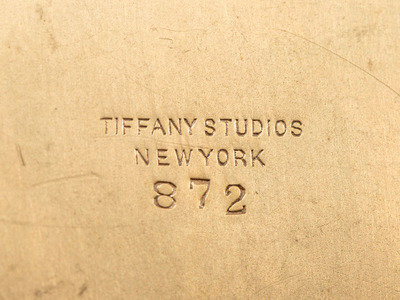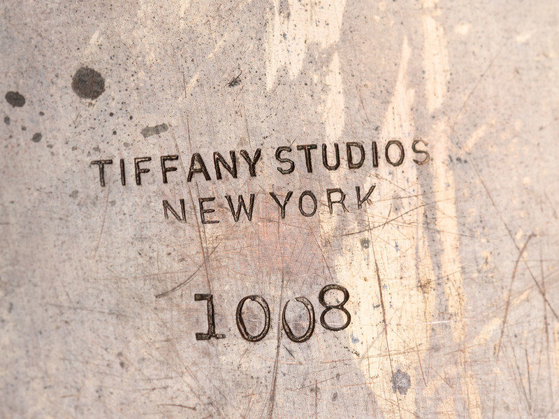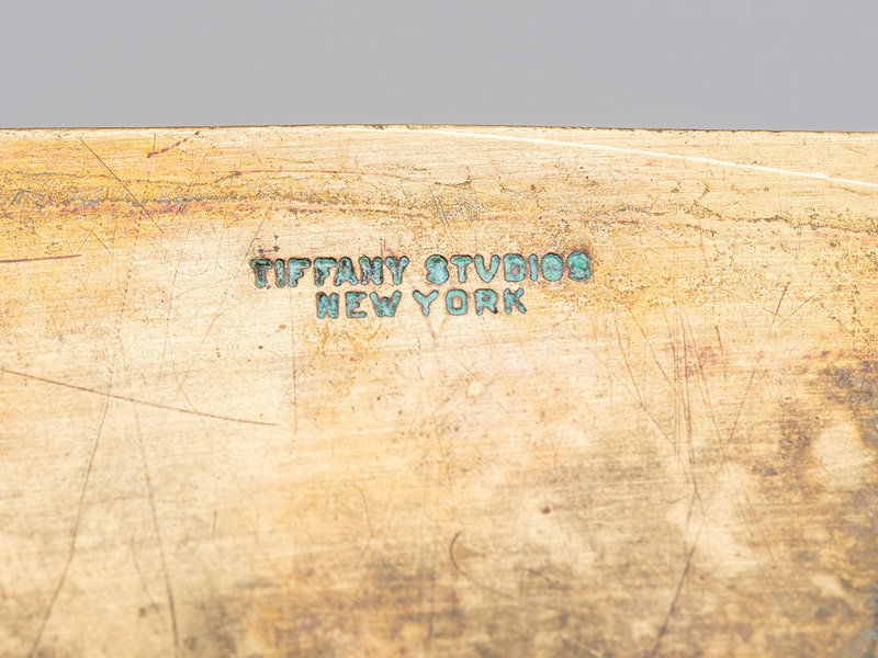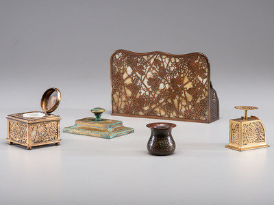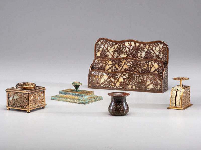 each marked 'Tiffany Studios / New York,' postage scale '872,' paper rack '1008,' inkwell '845,' pen wipe '340,' paperweight unnumbered