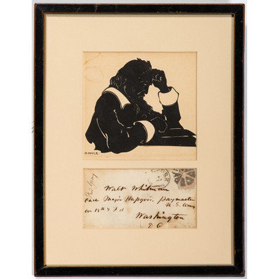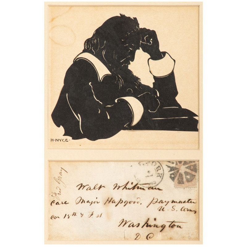 [With:] 5 1/8 x 5 in. papercut silhouette (visible area) of Whitman, mount signed "H.NYCE-" (possibly cut off from mat). Matted and framed together with postcard, 9 3/4 x 12 3/4 in.