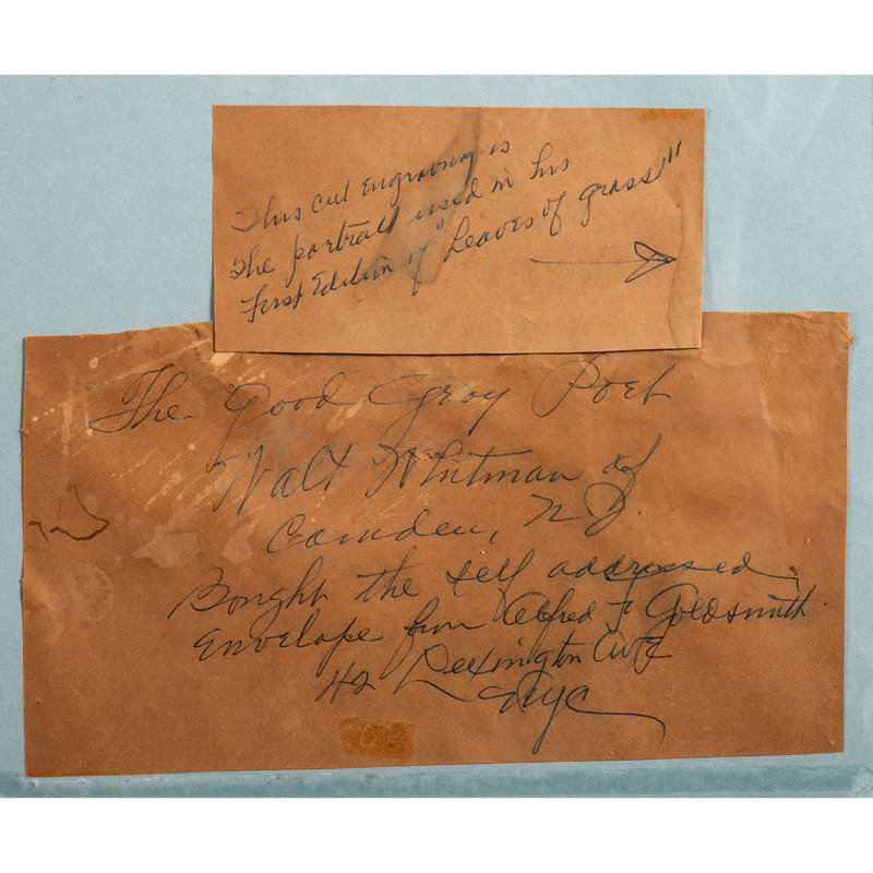 A note on the verso relates that the papercut was used in his first edition of Leaves of Grass, however, the only plate used in that edition was a steel engraved frontispiece of the poet at age 37. Here, Whitman is very much the "The Good Gray Poet," with a long beard and aged features. Though it is possible that it was used for a later edition of Leaves or another Whitman publication, it remains unidentified.