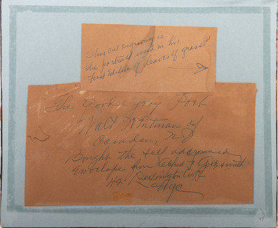 5 1/8 x 2 3/4 in. (visible area) postcard mailed from Fred Gray in 1863 to Walt Whitman care of US Army Paymaster Major Hapgood.