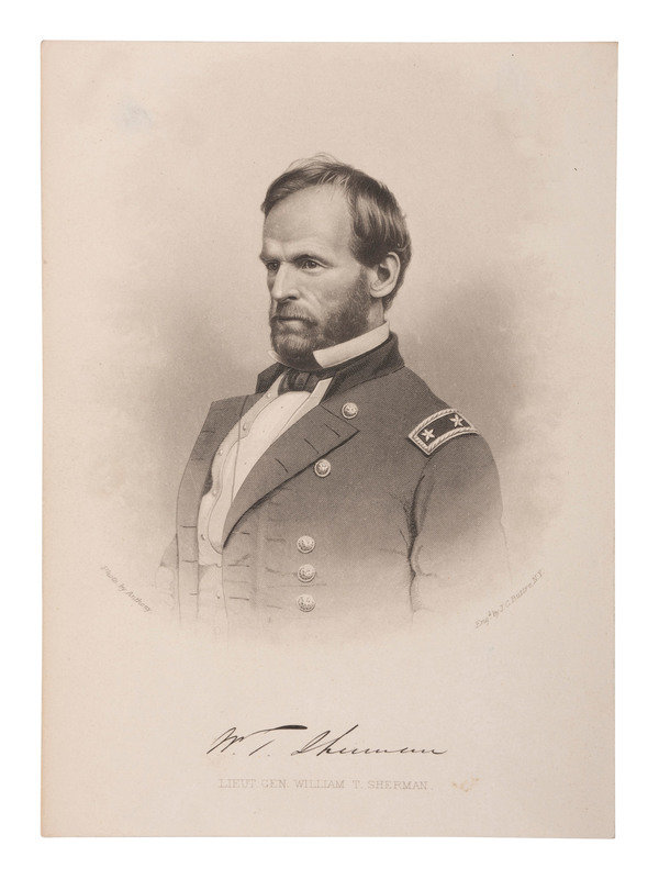 [With:] Head-and-shoulders portrait on paper of "Lieut. Gen. William T. Sherman," engraved by John Chester Buttre (1821-1893), photo by Anthony. Approx. 5 x 7 in. (light soil, adhesive residue on verso).