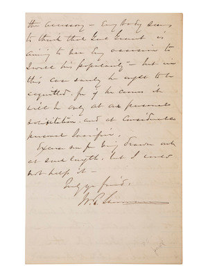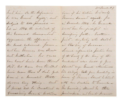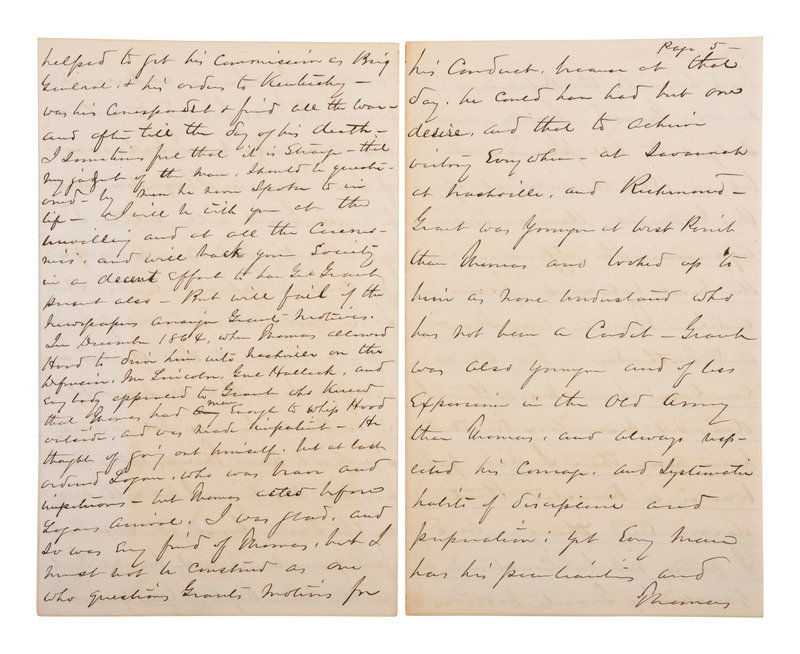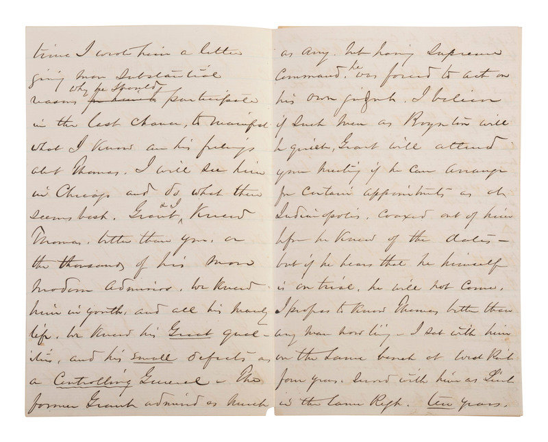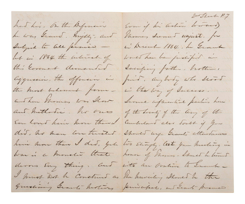 "...I wrote him [Grant] a letter giving him substantial reasons why he should participate in the last chance to manifest what I know are his feelings about Thomas....Grant and I knew Thomas, better than you or the thousands of his more modern admirers....Grant was also younger and of less experience in the Old Army than Thomas, and always respected his courage and systemic habits of discipline and preparation; yet every man has his peculiarities and Thomas had his. On the Defensive he was Grand. Mighty, and subject to all praise, but in 1864 the interest of this government demanded aggression. The offensive in the most vehement form, and here Thomas was slow and methodic. No one ever loved him more than I did. No man ever trusted him more than I did. Yet war is a monster that devours everything, and I must not be construed as questioning Grants motives even if his actions towards Thomas seemed unjust, for in December 1864, he Grant would have been justified in sacrificing father, brother, friend, anybody who stood in the way of success...." Sherman closes the letter with remarks about how Grant's participation in the ceremony might be perceived, noting that the focus should be on Thomas. "The unveiling should be the principal and Grant's presence the accessory."