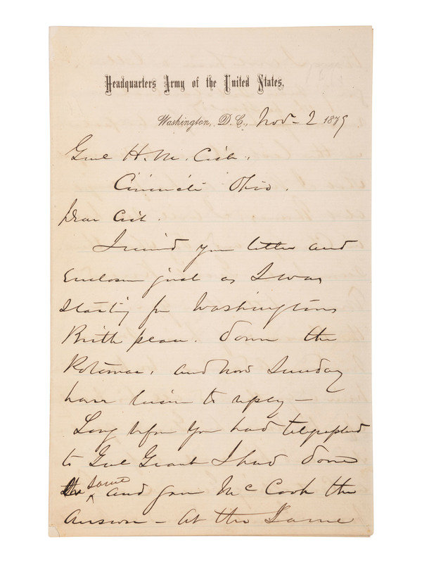 [CIVIL WAR]. SHERMAN, William Tecumseh (1820-1891). Autograph letter signed ("W.T. Sherman"), as Commanding General of the US Army, to General Henry M. Cist (1839-1902). Washington, D.C. 2 November 1879.