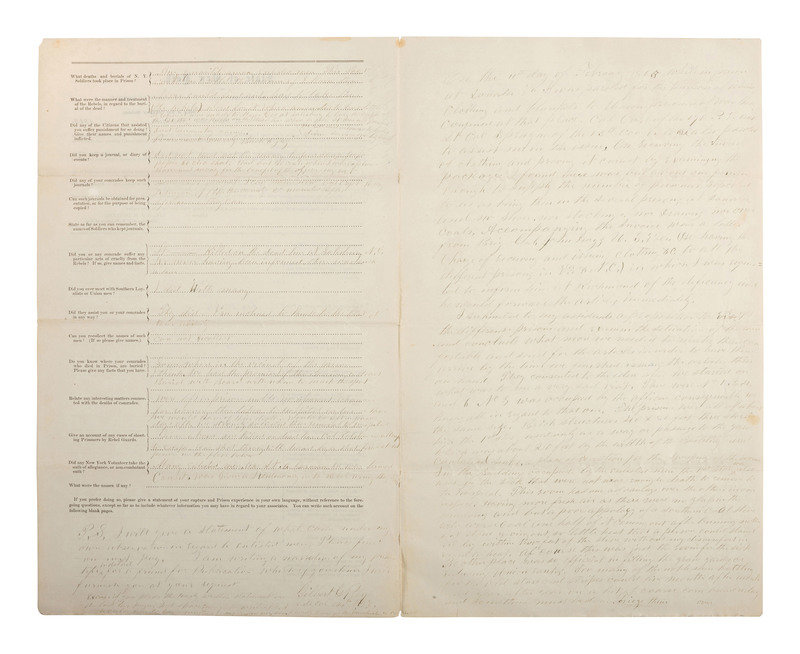 2pp partially printed questionnaire followed by blank leaf to allow for "a statement of your capture and Prison experience in your own language, without reference to the foregoing questions." 8 1/2 x 14 in. (light soil, creasing at folds, ink faded in places though text remains legible).