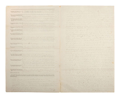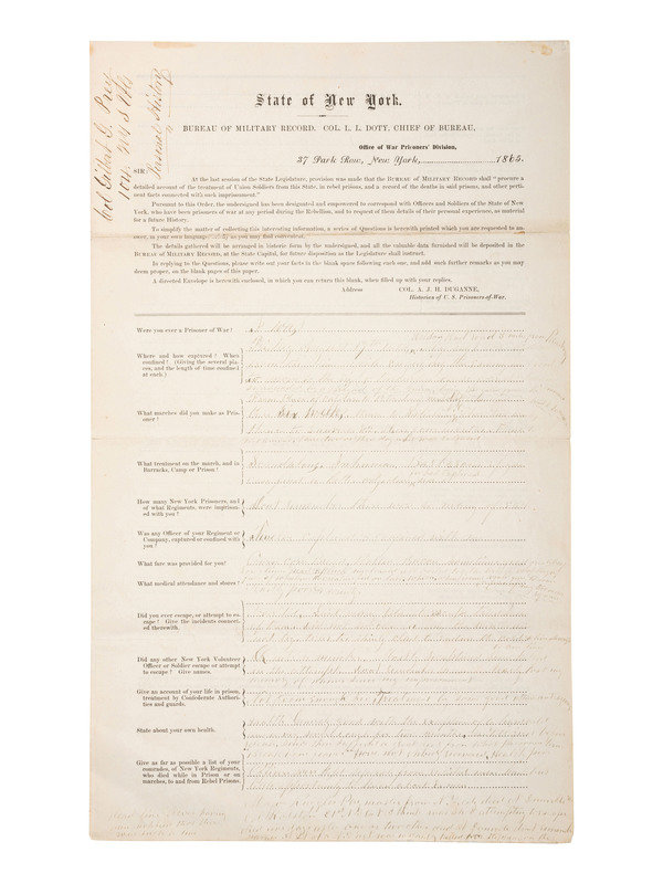 [CIVIL WAR]. Prisoner of war questionnaire from the Bureau of Military Record, State of New York, completed by Col. Gilbert G. Prey, 104th New York Volunteers, commanding officer at Gettysburg and POW at Weldon Railroad, ca 1865.