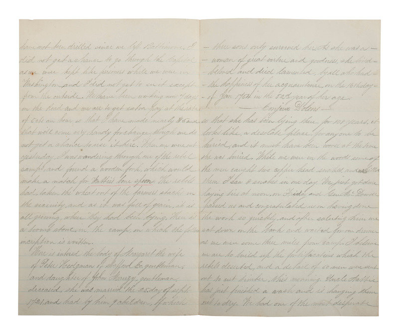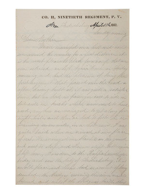 The first letters from April 1862 describe the journey from Philadelphia to Baltimore, then Washington. Albert checks out the "high points" in both Baltimore and Washington to get a overview of the area. Unfortunately, some buildings in Washington are closed. (Head Quarters Patterson Park Barracks, (inside) April 1, 1862; Near Fredericksburg, April 11, 1862; Patterson Park Barracks, April 14, 1862)