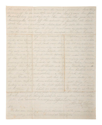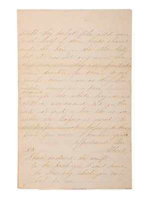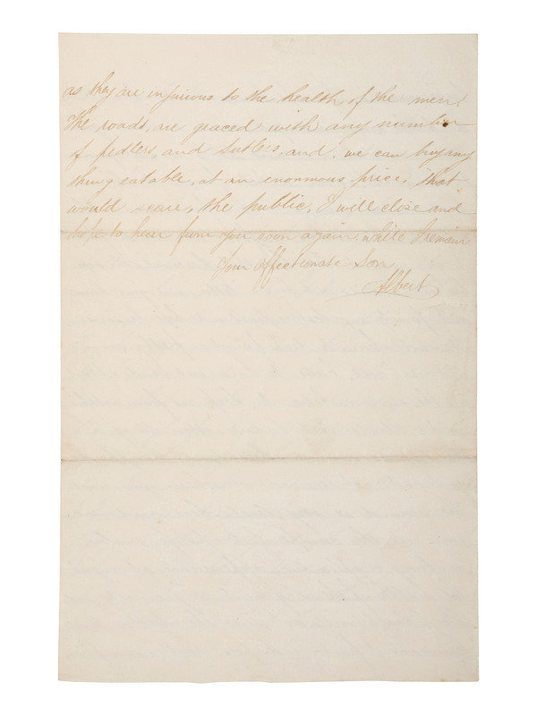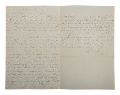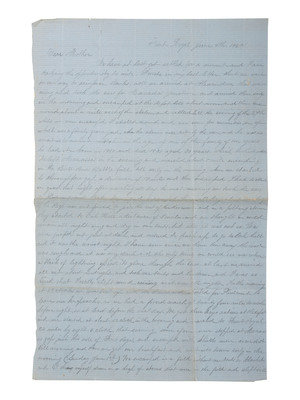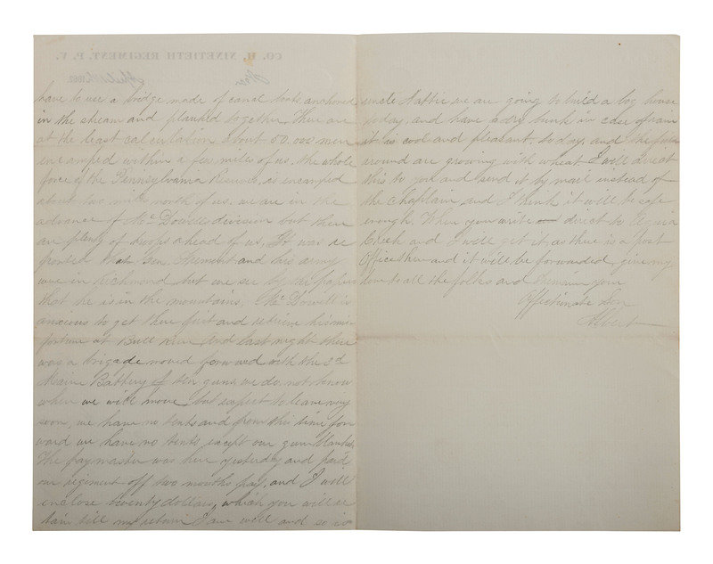 13 letters all from Albert Campbell Johnston (1839-1923) to his mother, Sarah Dilhorn Johnston (1812-1903). Enlisted in 90th Pennsylvania Vol. Infantry in late November 1861 along with his uncle, his mother’s brother, Nathaniel Dllhorn (1818-1902). Throughout these letters to his mother, written between the 1st of April and mid-September 1862, he mentions “Uncle Nattie,” as well as his own siblings “Vic” (Mary Victoria) and Walter. It is unclear who Alexander is, but he seems to be another extended relative living in Washington, DC. The last letter in this group names a number of family members who got together at Alexander’s house in September 1862. Albert survived the war and married a few years after returning home, to Frances Cooper, and they had three children, two of whom survived into adulthood.