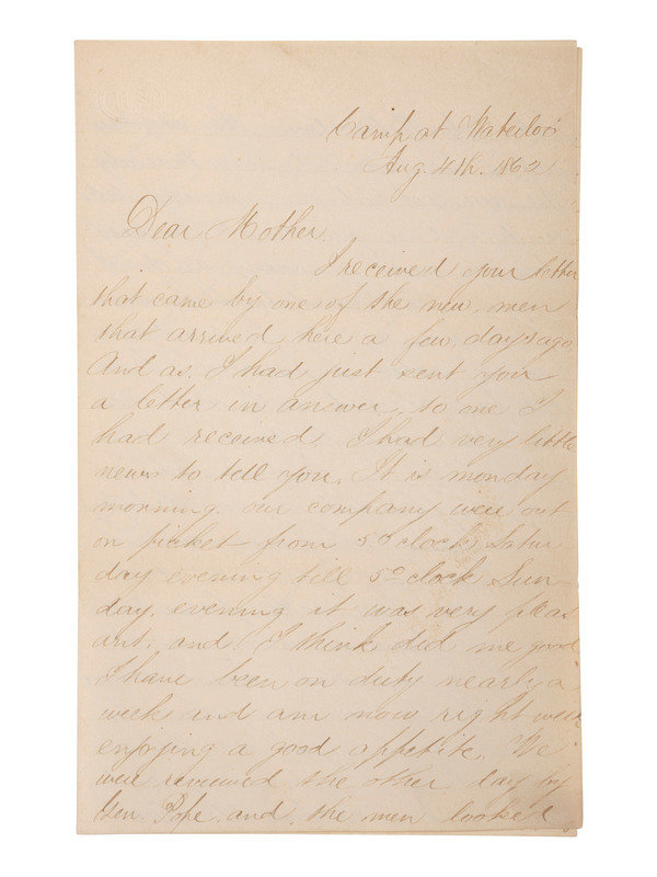 "We were notified one evening to be ready and on parade at ½ past five the next morning and suppose the Gen. did it to see if the men would be ready with out any extra preparation, but the men looked well and when the whole camp de Armee were drawn up in line together it was a splendid sight. Artillery cavalry and Infantry, consisting of about 1,2000 men. And when the Gen. (Pope) rode past the cannons fired a salute and each regimental band played a patriotic tune making it quite a treat, as it was all in the cool of the morning and was all over before 7 o’clock. So you can see that a large force can be brought together as early in the morning as they would generally get out of bed…"