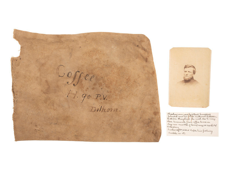 Cloth bag, approx. 7 x 9 in. with hand-lettering "Coffee / H 990 P.V. / Dilhorn." This was reportedly used by Nathaniel and Albert to hold their favorite coffee beans in the field.