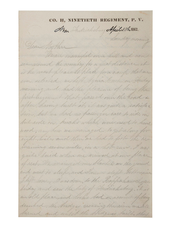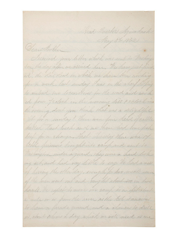 Head Quarters Aquia Creek May 3d 1862. “Last Tuesday there were 17 rebel prisoners brought into camp and sent to Washington under a guard. They were a hard looking set, and had very little to say."